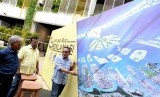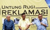 Peneliti LP3ES Dasmir Good, Ketua Fraksi Golkar DPRD DKI Jakarta Ashraaf Ali, dan Wakil Ketua DPRD DKI Jakarta M Taufik (dari kiri) melihat peta rekalamasi jakarta saat diskusi di DPD Golkar DKI Jakarta, Ahad (29/10). (FOTO : Republika/ Wihdan)