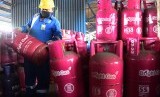 Seorang petugas mengangkat tabung LPG non subsidi Pertamina Bright Gas 12 kilogram di Depot LPG Pertamina Tanjung Perak Surabaya, Jawa Timur, Selasa (24/10). (FOTO : Antara/M Risyal Hidayat)