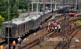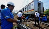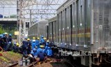 REPUBLIKA.CO.ID, JAKARTA -- Petugas memperbaiki Kereta Rel Listrik (KRL) jurusan Depok-Jatinegara yang anjlok di Stasiun Jatinegara, Jakarta Timur, Senin (30/10).