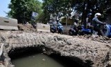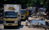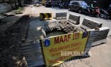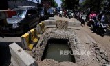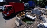 REPUBLIKA.CO.ID, JAKARTA -- Sejumlah kendaraan melintas di samping pagar beton yang menutupi lubang galian proyek boks utilitas di Jalan Lodan Raya, Pademangan, Jakarta Utara, Senin (30/10).