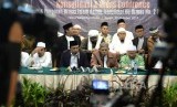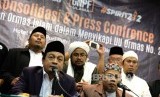 Tolak Disahkannya Perppu Ormas. Anggota GNPFAbah Raodl Bahar (kedaua kanan) membacakan seruan saat konferensi pers GNPF Ulama di Jakarta, Senin (30/10). (FOTO : Republika/ Wihdan)