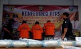 Polisi saat menunjukkan barang bukti dan tersangka kasus penyelundupan narkotika transnasional dari Taiwan di Polda Metro Jaya, Jakarta, Kamis (2/11). (FOTO : Republika/Putra M. Akbar)