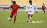 Gelandang Timnas Indonesia U-19 M Iqbal mencoba melewati pesepak bola Timor Leste J Soares pada Kualifikasi Piala Asia U-19 2018 di Paju Public Stadium, Korea Selatan, Kamis (2/11). (FOTO : Humas PSSI/Antara)
