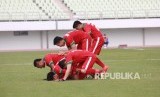 Para pemain timnas Indonesia U-19 merayakan gol ke gawang Timor Leste dengan sujud syukur. (FOTO : dok. PSSI)