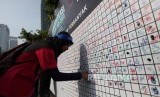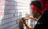 Seorang pelajar menandatangani dukungan deklarasi siberkreasi melawan hoax saat acara Siberkreasi Netizen Fair 2017 di kawasan CFD, Jalan Sudirman, Jakarta, Ahad (5/11). (FOTO : Republika/Mahmud Muhyidin)