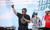 Menkominfo Rudiantara memberikan sambutan saat acara Siberkreasi Netizen Fair 2017 di kawasan CFD, Jalan Sudirman, Jakarta, Ahad (5/11). (FOTO : Republika/Mahmud Muhyidin)