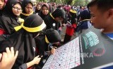 Sejumlah pelajar menandatangani dukungan deklarasi siberkreasi melawan hoax saat acara Siberkreasi Netizen Fair 2017 di kawasan CFD, Jalan Sudirman, Jakarta, Ahad (5/11). (FOTO : Republika/Mahmud Muhyidin)
