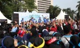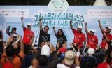 Menkominfo Rudiantara didampingi Komisi Penyiaran Indonesia (KPI) Yuliandre Darwis dan artis Indonesia mendeklarasikan siberkreasi melawan hoax saat acara Siberkreasi Netizen Fair 2017 di kawasan CFD, Jalan Sudirman, Jakarta, Ahad (5/11). (FOTO : Republika/Mahmud Muhyidin)