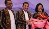 Direktur Umum / Plt Dirut PT Bank Pembangunan Daerah Maluku dan Maluku Utara (BPD Maluku Malut) Arief Burhanudin W (tengah), Direktur Izaac Thenu (kiri) dan Direktur Aleta d Costa berbincang usai acara konferensi pers di Jakarta, Selasa (7/11). (FOTO : Darmawan / Republika)