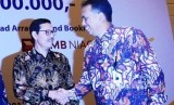 Direktur Keuangan Waskita Karya Tunggul Rajagukguk (kiri) dan SVP Corporate Banking Bank Mandiri Dikdik Yustandi bersalaman usai menandatangani perjanjian kredit sindikasi senilai Rp5,14 triliun di Jakarta, Selasa (7/11). (FOTO : Darmawan / Republika)
