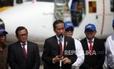 Presiden Joko Widodo didampingi pejabat terkait memberikan keterangan kepada media saat acara Pemberian Nama Pesawat N219 di Bandara Halim Perdana Kusuma, Jakarta, Jumat (10/11). (FOTO : Republika/Mahmud Muhyidin)