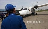 Petugas mengamati Pesawat N219 yang terparkir di Bandara Halim Perdana Kusuma saat acara Pemberian Nama Pesawat N219 oleh Presiden RI, Jakarta, Jumat (10/11). (FOTO : Republika/Mahmud Muhyidin)