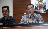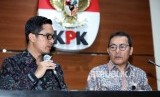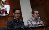 Wakil Ketua KPK Saut Situmorang (kanan) didampingi Jubis KPK Febri Diansyah (kiri) memberikan keterangan kepada media saat konferensi pers di Gedung KPK, Jakarta, Jumat (10/11). (FOTO : Republika/Mahmud Muhyidin)