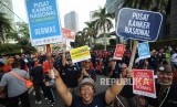 REPUBLIKA.CO.ID, JAKARTA -- Peserta puncak peringatan Hari Kesehatan Nasional ke-53 membawa poster ajakan hidup sehat di hari Bebas Kendaraan Bermotor di Bundaran HI, Jakarta, Ahad (12/11).