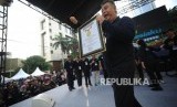 Bergembira, Sekjen Kemenkes Dr Untung Suseno Sutarjo membawa piagam MURI memecahkan senam peregangan terbanyak dan serentak dalam puncak Hari Kesehatan Nasional ke 53 dalam Hari Bebas Kendaraan Bermotor di Bundaran HI, Jakarta, Ahad (12/11). (FOTO : Republika/Iman Firmansyah)
