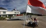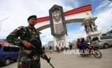 Petugas TNI menjaga di Pos Lintas Batas Negara Skouw, Jayapura, Papua, Selasa (14/11). (FOTO : Republika/Mahmud Muhyidin)