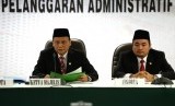 Putusan Gugatan Parpol Peserta Pemilu. Ketua Badan Pengawas Pemilu (Bawaslu) Abhan (tengah) bersama Anggota Bawaslu membacakan putusan dugaan pelanggaran administrasi yang dilaporkan sepuluh partai politik (parpol) terhadap proses pendaftaran parpol peserta Pemilu 2019, Jakarta, Rabu (15/11). (FOTO : Republika/ Wihdan)