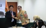 Putusan Gugatan Parpol Peserta Pemilu. Anggota KPU Hasyim Asyari menyalami perwakilan parpol sebelum sidang putusan dugaan pelanggaran administrasi yang dilaporkan sepuluh partai politik (parpol) terhadap proses pendaftaran parpol peserta Pemilu 2019, Jakarta, Rabu (15/11). (FOTO : Republika/ Wihdan)
