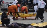 Anggota Disaster Victim Identification (DVI) dan tim medis menangani korban tewas akibat serangan teroris saat simulasi penanggulangan teror di Bandara Ngurah Rai, Bali, Jumat (17/11). (FOTO : Antara/Nyoman Budhiana)
