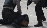 Polisi antiteror membekuk teroris yang menyerang delegasi negara asing pada konferensi tingkat menteri saat simulasi penanggulangan teror di Bandara Ngurah Rai, Bali, Jumat (17/11). (FOTO : Antara/Nyoman Budhiana)