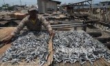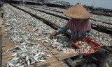 REPUBLIKA.CO.ID, JAKARTA -- Pekerja menjemur ikan asin di kawasan Muara Angke, Penjaringan, Jakarta Utara, Ahad (19/11).