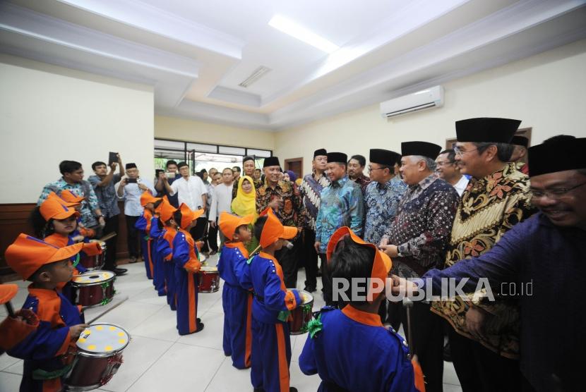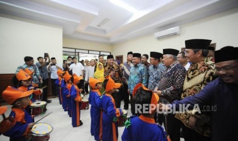 Disambut. Ketua Umum PP Muhammadiyah Haedar Nashir (Kiri), Kapolri Jendral POL Tito Karnavian(Kedua Kiri), Ketua Ranting Muhammadiyah Pondok Labu Din Syamsudin(Kedua Kanan), Ketua Penasihat Ranting Muhamadiyah Pondok Labu Jimly Asshiddiqie (Kanan) Menyapa anak yang menyambut dengan marching band dalam acara Syukuran Dua Tahun Muhammadiyah Ranting Pondok Labu,Jakarta, Ahad (19/11). (FOTO : Republika/Iman Firmansyah)