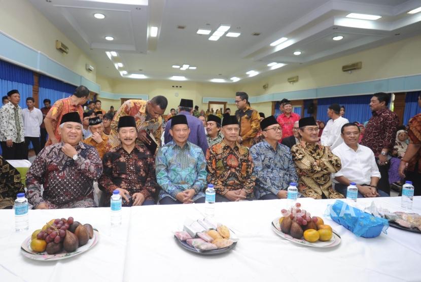 Ketua Ranting Muhammadiyah Pondok Labu Din Syamsudin(Kiri) Rully Chairul Azwar, Kapolri Jendral POL Tito Karnavian(Ketiga Kiri) Ketua Umum PP Muhammadiyah Haedar Nashir (Temgah) Ketua MPR RI Zulkifli hasan(Ketiga Kanan) Ketua Penasihat Ranting Muhamadiyah Pondok Labu Jimly Asshiddiqie (Kedua Kanan) menghadiri acara Syukuran Dua Tahun Muhammadiyah Ranting Pondok Labu,Jakarta, Ahad (19/11). (FOTO : Republika/Iman Firmansyah)