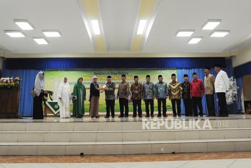Ketua Ranting Muhammadiyah Pondok Labu Din Syamsudin menerima penyerahan berkas akta Koperasi syariah Muhammadiyah dalam acara Syukuran Dua Tahun Muhammadiyah Ranting Pondok Labu,Jakarta, Ahad (19/11). (FOTO : Republika/Iman Firmansyah)