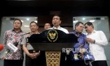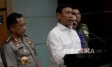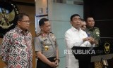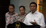 REPUBLIKA.CO.ID, JAKARTA -- Menkopolhukam Wiranto didampingi Kapolri Jenderal Polisi Tito Karnavian dan Menkominfo Rudiantara memberikan keterangan terkait keamanan Papua di Kantor Kemenko Polhukam, Jakarta Pusat, Senin (20/11).