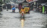 Pengendara motor melintasi banjir di kawasan Pasar Gedebage, Bandung, Jawa Barat, Senin (20 /11). Tingginya intensitas curah hujan yang melanda kota Bandung dan kurang baiknya drainase mengakibatkan banjir di kawasan pasar Gedebage terus menerus. (FOTO : Novrian Arbi/Antara)