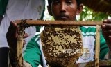 HUTAN KEMASYARAKATAN Petani peserta program Kelompok Usaha Perhutanan Sosial (KUPS) Kelompok Tani Hutan-‘Ingin Maju’ menunjukkan sarang lebah yang dipelihara di Lahan Gunung Langkaras, Tebing Siring, Kabupaten Tanah Laut, Kalsel, Rabu (22/11). (FOTO : Republika/Yogi Ardhi)