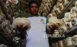 HUTAN KEMASYARAKATAN Petani peserta program Kelompok Usaha Perhutanan Sosial (KUPS) Kelompok Tani Hutan-‘Ingin Maju’ menunjukkan jamur tiram dibudidayakan di Lahan Gunung Langkaras,Tebing Siring, Kabupaten Tanah Laut, Kalsel, Rabu (22/11). (FOTO : Republika/ Yogi Ardhi)