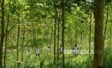 HUTAN KEMASYARAKATAN Petani peserta program Hutan Kemasyarakatan melintasi pohon karet yang ditanam Lahan Gunung Langkaras, Tebing Siring, Kabupaten Tanah Laut, Kalsel, Rabu (22/11). (FOTO : Republika/ Yogi Ardhi)