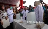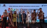 Menteri Koordinator Bidang PMK Puan Maharani (tengah) bersama Kepala Badan POM Penny K Lukito (ketiga kanan) dan Ketua Pkk Pusat Erni Guntarti Tjahjo (keempat kiri) melakukan numbuk lumbung padi sebagai membuka pencanangan Gerakan Masyarakat Hidup Sehat Sadar Pangan Aman (Germas Sapa) di Taman Mini Indonesia Indah, Jakarta, Kamis (23/11). (FOTO : Mahmud Muhyidin/Republika)