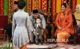 Putri Presiden Joko Widodo, Kahiyang Ayu (kedua kanan) bersama suaminya Bobby Afif Nasution memegang Ethes anak Gibran Rakabuming di sela ritual adat "Mangalo-alo Mora" pada ngunduh mantu resepsi pernikahannya di Medan, Sumatera Utara, Jumat (24/11). (FOTO : Septianda Perdana/ANTARA)