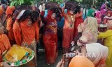 Sejumlah kerabat dan keluarga marga Siregar membawa persembahan Itak Godang ketika mengikuti 'ngunduh mantu' pernikahan Kahiyang Ayu-Bobby Nasution, di Medan, Sumatra Utara, Jumat (24/11). Itak Godang adalah barang bawaan berbungkus kain ulos warna hitam dan merah yang dibawa oleh para ibu pihak keluarga Siregar. Bungkusan ini berisi aneka makanan khas suku Mandailing untuk persembahan khusus dari pihak keluarga marga Siregar kepada pihak pengantin. (FOTO : Septianda Perdana/ANTARA)