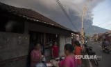 Masyarakat beraktivitas dengan latar belakang Gunung Agung meletus, di Desa Culik, Karangasem, Bali, Ahad (26/11). (FOTO : Antara/Fikri Yusuf)
