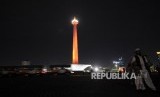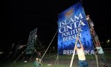 Sejumlah petugas mendirikan spanduk dalam rangka persiapan reuni aksi 212 di kawasan Monas, Jakarta Pusat, Jumat (1/12). (FOTO : Putra M Akbar)