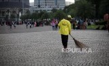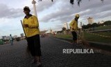 Petugas membersihkan sampah di lapangan Monumen Nasional Pasca Aksi Reuni 212, Jakarta, Sabtu (2/12). (FOTO : Republika/Mahmud Muhyidin)