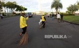 Sejumlah petugas membersihkan sampah di lapangan Monumen Nasional Pasca Aksi Reuni 212, Jakarta, Sabtu (2/12). (FOTO : Republika/Mahmud Muhyidin)