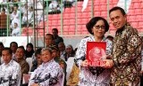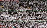 Guru memenuhi kursi tribun stadion saat menghadiri acara puncak peringatan Hari Guru Nasional di Stadion Patriot Candrabhaga, Bekasi, Jawa Barat, Sabtu (2/12). (FOTO : Risky Andrianto/Antara)