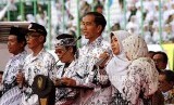 Presiden Joko Widodo (tengah) berdialog dengan sejumlah guru saat menghadiri acara puncak peringatan Hari Guru Nasional di Stadion Patriot Candrabhaga, Bekasi, Jawa Barat, Sabtu (2/12). (FOTO : Risky Andrianto/Antara)
