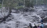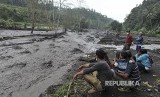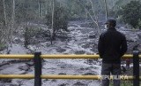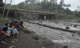 Aliran lahar dingin di Sungai Yeh Sah menjadi tontonan warga. Jutaan meter kubik abu vulkanis letusan Gunung Agung yang terbawa arus sungai menjadi bahan tontonan warga di pinggir sungai dan jembatan