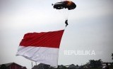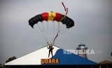 Prajurit Polairud melakukan atraksi terjun payung saat peringatan Parade HUT ke-67 Korps Polisi Air dan Udara (Korpolairud) Baharkam Polri di Mako Korpolairud Baharkam Polri, Pondok Cabe, Tangerang Selatan, Banten, Selasa (5/12). (FOTO : Republika/Mahmud Muhyidin)