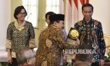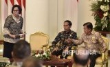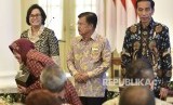 Presiden Joko Widodo (tengah) bersama Wakil Presiden Jusuf Kalla (kanan) dan Menteri Keuangan Sri Mulyani (kiri) menghadiri Penyerahan Daftar Isian Pelaksanaan Anggaran (DIPA), Buku Daftar Alokasi Transfer ke Daerah dan Dana Desa Tahun 2018 serta penganugerahan Dana Rakca tahun 2018, di Istana Kepresidenan Bogor, Jawa Barat, Rabu (6/12). (FOTO : Antara/Puspa Perwitasari)