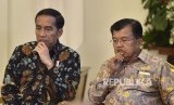 Presiden Joko Widodo (kiri) bersama Wakil Presiden Jusuf Kalla (kanan) menyimak pemaparan Menteri Keuangan Sri Mulyani saat Penyerahan Daftar Isian Pelaksanaan Anggaran (DIPA), Buku Daftar Alokasi Transfer ke Daerah dan Dana Desa Tahun 2018 serta penganugerahan Dana Rakca tahun 2018, di Istana Kepresidenan Bogor, Jawa Barat, Rabu (6/12). (FOTO : Antara/Puspa Perwitasari)