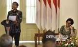 Presiden Joko Widodo (kiri) didampingi Menteri Keuangan Sri Mulyani (kanan) menyampaikan arahan saat Penyerahan Daftar Isian Pelaksanaan Anggaran (DIPA), Buku Daftar Alokasi Transfer ke Daerah dan Dana Desa Tahun 2018 serta penganugerahan Dana Rakca tahun 2018, di Istana Kepresidenan Bogor, Jawa Barat, Rabu (6/12). (FOTO : Antara/Puspa Perwitasari)