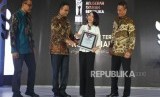 Menteri Agama Lukman Hakim Syaifuddin (kedua kiri) memberikan kepada perwakilan pemenang Unit Usaha Bank Syariah Bank CIMB Syariah dalam Anugerah Syariah Republika (ASR) 2017 di Jakarta, Rabu (6/12) malam. (FOTO : Republika/Iman Firmansyah)
