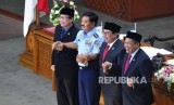 Calon Panglima TNI Marsekal Hadi Tjahjanto (kedua kiri) berfoto bersama dengan Wakil Ketua DPR Taufik Kurniawan (kiri), Fadli Zon (kedua kanan) dan Fahri Hamzah (kanan) dalam Sidang Paripurna DPR di Kompleks Parlemen, Senayan, Jakarta, Kamis (7/12). (FOTO : Republika/Prayogi)