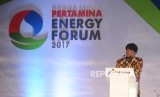 Sambutan. Direktur Utama Pertamina Elia Massa Manik dalam sambutan pembukaan Pertamina Energy Forum 2017 di Jakarta, Selasa (12/12). (FOTO : Republika/Iman Firmansyah)